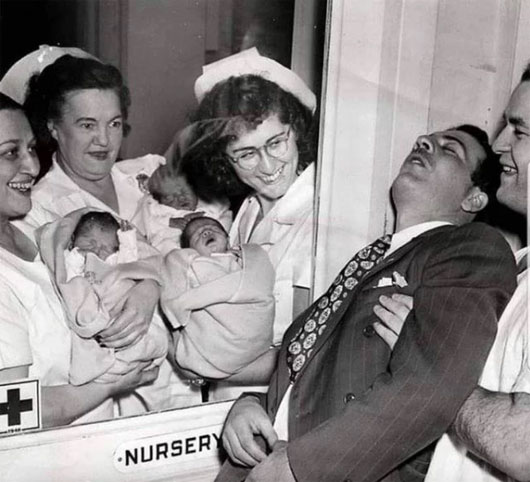 Enfermeras que muestran los trillizos a un padre sorprendido