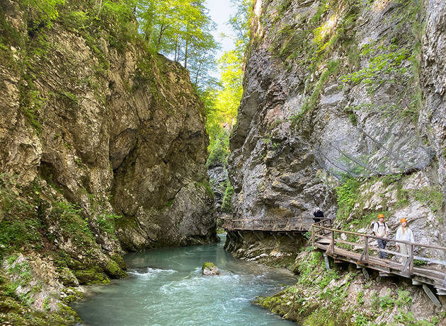 tallado por el cauce de un río, con una espesa vegetación, una rica