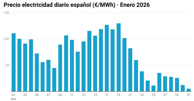 en 15,11 euros el MWh en enero, un 29 % más que en el mismo